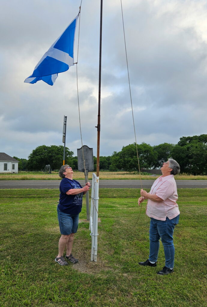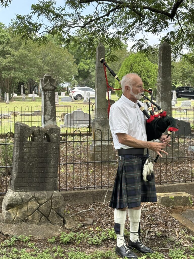 After lunch, many of us drove to nearby Milford, Texas. We walked the row of graves and honored several ancestors. Anthony Miculka—husband of Becky Williams Miculka and son-in-law of Pat Ferguson Williams—played “Amazing Grace” and other songs on the bagpipes. He wore the Ferguson tartan kilt and stood with quiet strength beside the resting places of those who came before us.