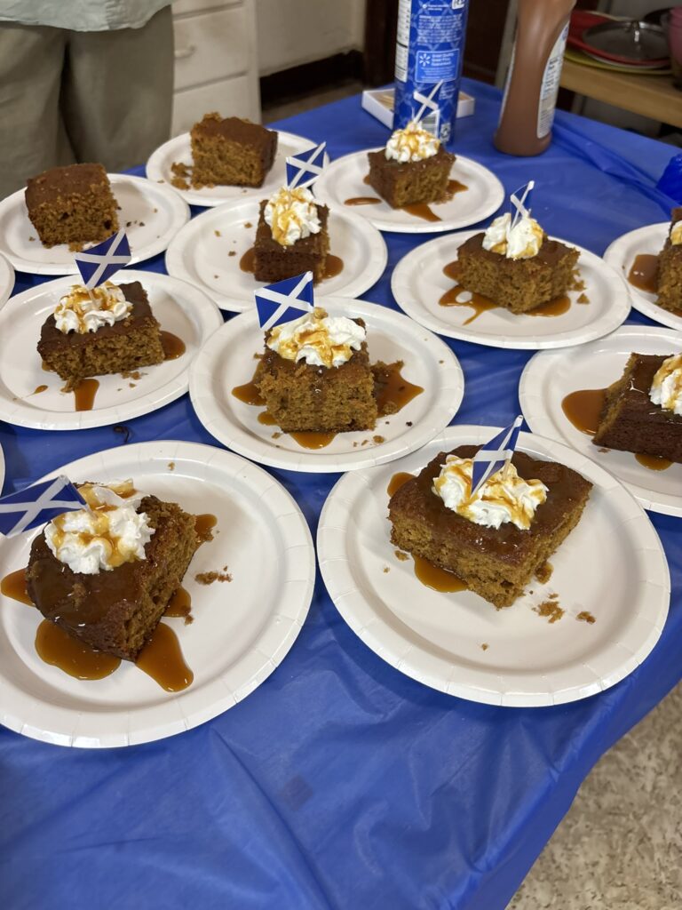 Descendants feasted on traditional Scottish dishes for lunch. Jana prepared haggis, cottage pie, and sticky toffee pudding. The thought of eating haggis filled many with trepidation. However, they anticipated tasting Scotland’s quintessential dish. Most were surprised at how much they actually liked it! Jerry ran the kitchen and directed the serving lines. He worked with three fantastic assistants: Christopher Ferguson, Tom Hill, and William Ferguson. Their teamwork kept everything flowing smoothly and cheerfully.